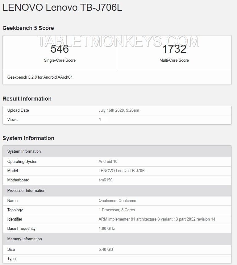Lenovo's 6GB RAM tablet was also benchmarked last month, where Lenovo TB-J706L achieved benchmark scores of 546 in single-core and 1732 in multi-core scores on Geekbench 5. So because this tablet is powered by the octa-core Qualcomm Snapdragon 675 processor, it only performs at about 60% of the capacity of the new Samsung Galaxy Tab S7 tablets.