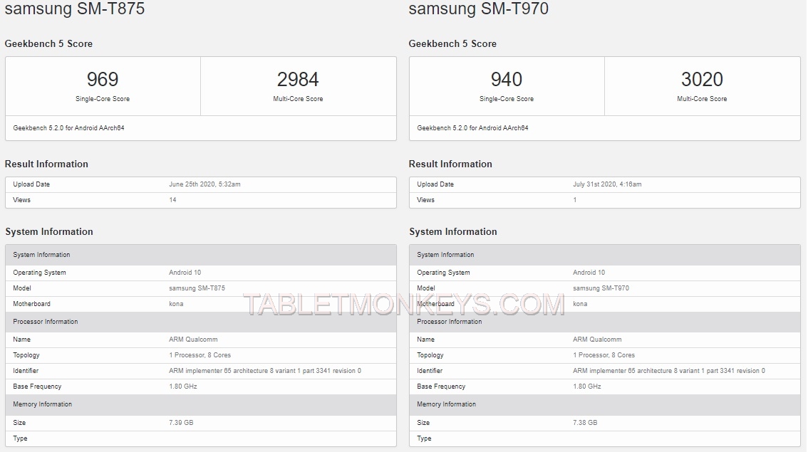 The Geekbench 5 benchmark scores for both the Samsung Galaxy Tab S7 and S7+ with 8GB of RAM clock in at just under 970 in single-core, and up to 3000 in multi-core scores.